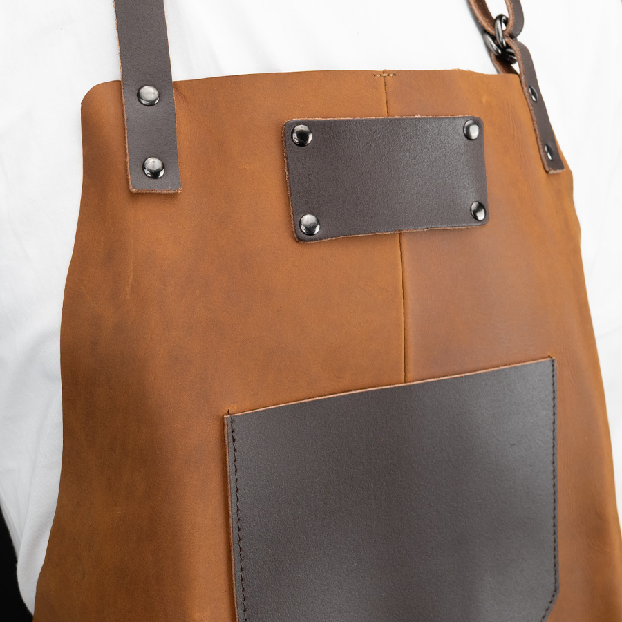 - Pechera de Asador en cuero 100% genuino (color café cognac), curtido, envejecido y suavizado para mayor resistencia y estilo.