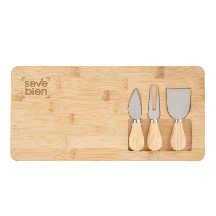 Tabla de bambú con set de 3 utensilios de acero inoxidable 420 con mango de madera de caucho: 1 cuchillo, 1 tenedor y 1 espátula.