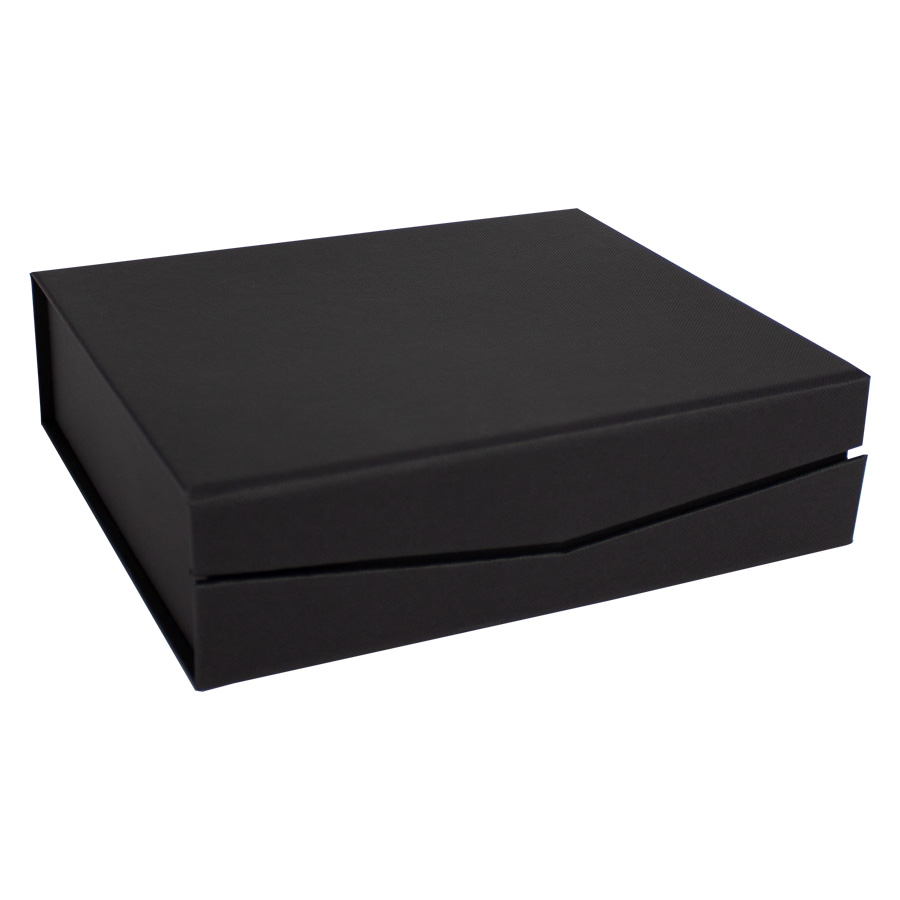 •Presentación: Caja de cartón forrado negro con cierre imantado, interior acolchado de espuma y tela poliéster satinado negro, con troquel.